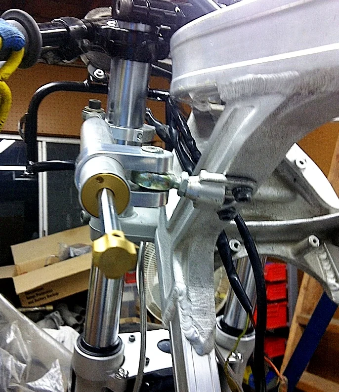 When the forks were installed on the bike, the fork brace/fender mount aluminum plate was doubled-up to give more stiffness to the forks. Also, a Storz adjustable steering damper was mounted to the left-side of the frame and the front fork leg.