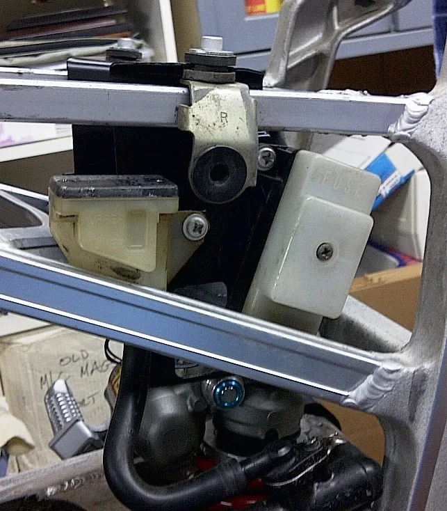 One of the steering stops was damaged and had to be repaired. When the steering damper was installed, a Slingshot style frame mount was placed on the left-side by drilling 2 holes in the upper rail.