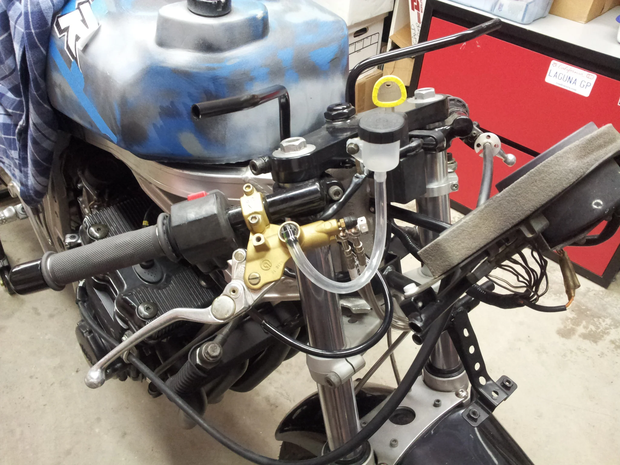 A Brembo 16mm front brake master cylinder was installed with a small, clutch-type reservoir. The original Suzuki rear brake master cylinder was rebuilt using an OE kit. Braided stainless steel brake lines from Spiegler were used front and rear.