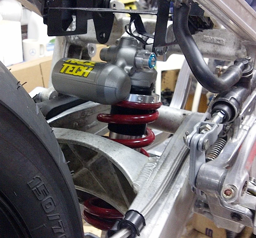 The new shock was sent to Race Tech for a complete rebuild and modification. They offer a Gold Valve kit, threaded spring adjuster (instead of a ramp type) and a damping curve to match the Suzuki linkage ratio. An Eibach 650 lbs./in. rear spring was installed.